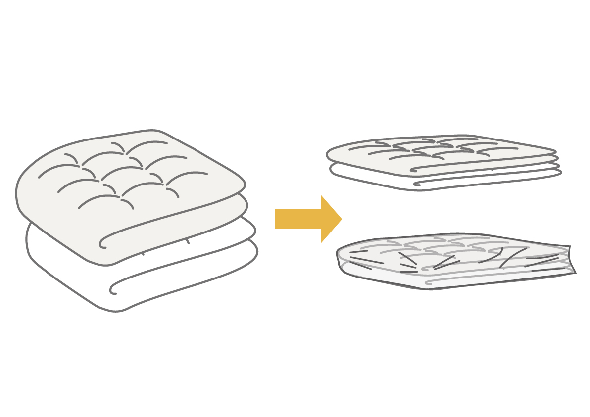 圧縮袋:ダウンや毛布などかさばるものは圧縮袋に入れて収納。最近は手押しタイプや繰り返し使えるジッパー付きが主流で、押入れやクローゼットのスペースを有効活用できます。