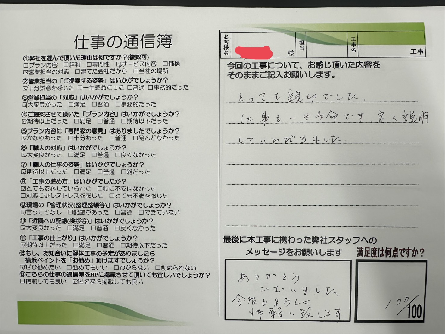 この度は横浜ペイントに屋根外壁塗装工事をお任せいただき有難うございました。